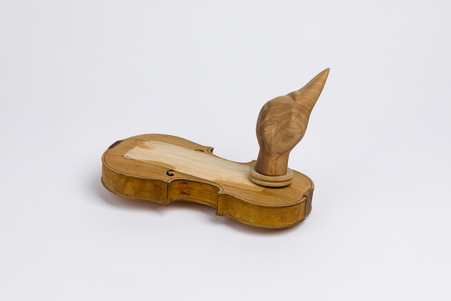 A signed, titled and (mis)dated fragment of a smashed violin from Miller's March 24, 1979 performance of Nam June Paik's "One for Violin Solo"....