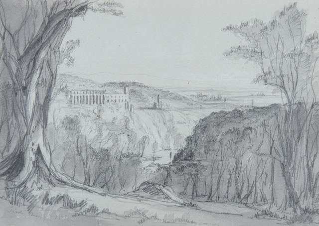Inscribed and dated l.l.: Tivoli May 7 ...1838, pencil and grey wash heightened with white on light grey paper, 7 1/16 × 9 7/8 in