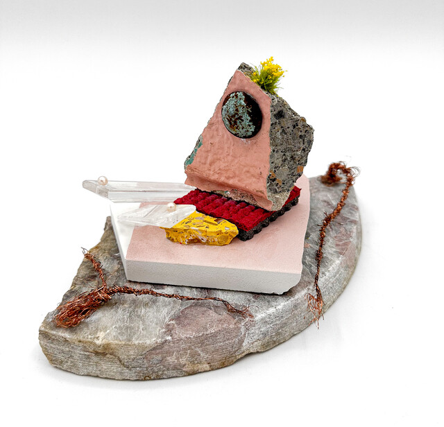 Gifted broken granite, broken tile, textile sample, broken concrete, rusty nail head, faux flowers, chandelier crystals, pearls, Brillo pad, 5 1/2 × 5 1/2 × 9 3/4 in.