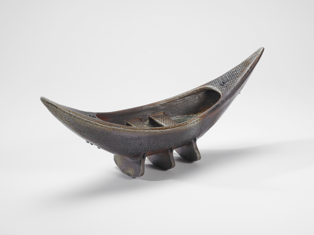 Woodfired stoneware, upcycled glass, steel, moonglow pear, kakishibu, linen and cotton thread, tea, 27 1/2 × 16 × 23 in...