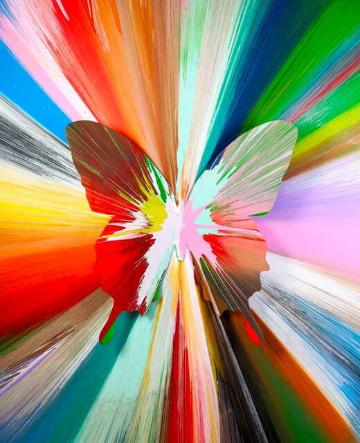 Acrylic on canvas with aluminium butterfly and diamond dust, 48 × 48 in.