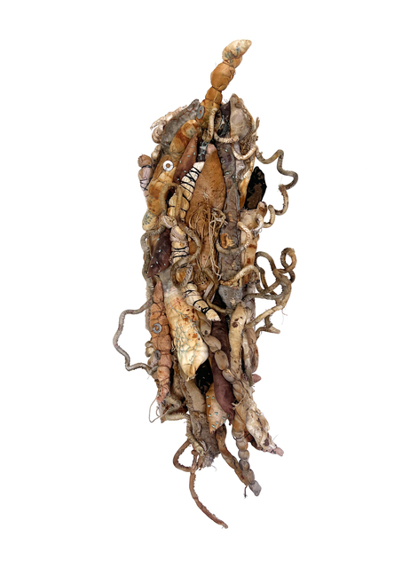 Eco and rust dyed rescued textiles, polyfil, wire, basket cord, thread, wool, string, washers, hardware cloth, 34 × 14 × 11 in...