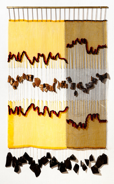 Aço, tela mosquiteiro, tela de proteção, linha de algodão, lã, miçangas e ardósia [steel, mosquito net, protective cloth, cotton thread, wool, beads and slate], 165...