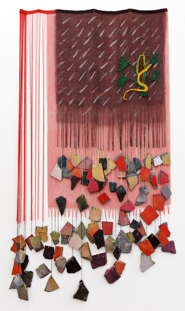 Tela de proteção, barra de latão, cordões de poliéster, cerâmica, pedras e vidro [safety net, brass bar, polyester laces, ceramics, stones and glass], 193 × 140 cm...