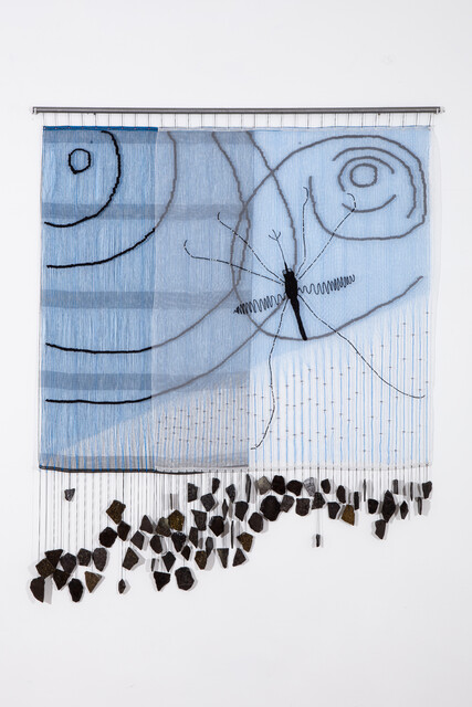 Aço, tela mosquiteiro, tela de proteção, linha de algodão, lã, miçangas e ardósia [steel, mosquito net, protective cloth, cotton thread, wool, beads and slate], 165 × 150 × 5 cm