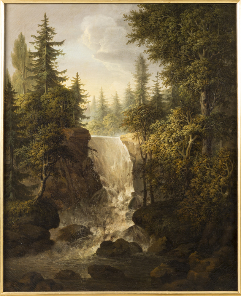 Title: Skovrigt landskab med et vandfald