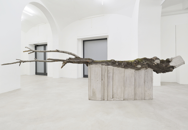 Concrete and tree bark, 320 × 60 × 140 cm.