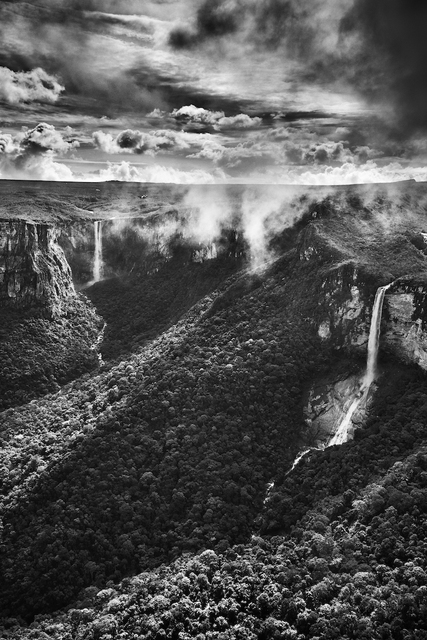 Sebastião Salgado, Aracá State Park. El Dorado Falls (background) and Desabamento Falls (foreground). Tepuis are geological mesa formations with sandstone and quartzite soil, and with water plunging down their sides in waterfalls. State of Amazonas, 2019