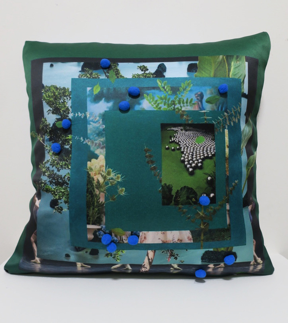 Polyester silk cushion, hand sewn beads, thread, pom poms, 45.