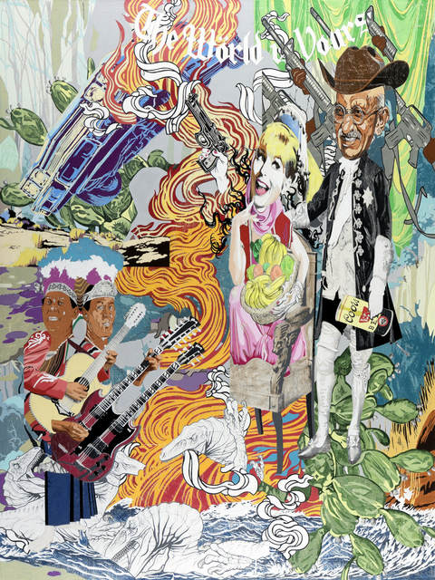 Acrylic, graphite, charcoal, and transfer on wood, 48 × 36 in.