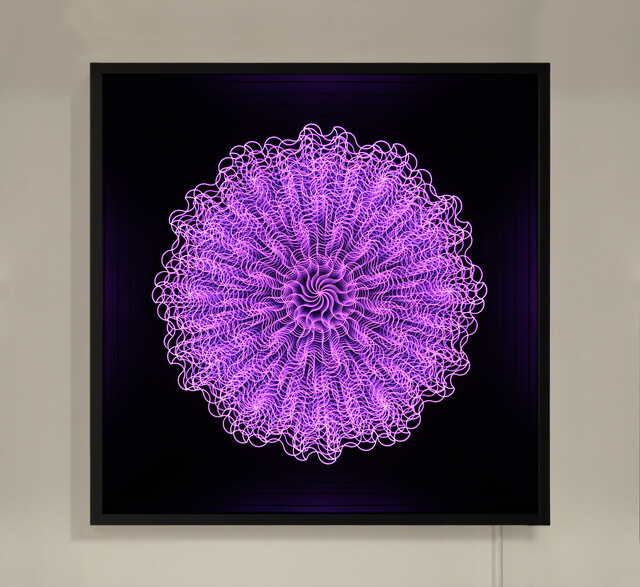 Pigments on plexiglas, white LED, aluminum, 80 × 80 × 6 cm...