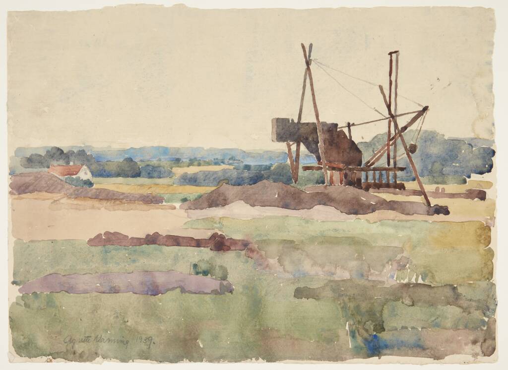 Title: Landskab fra Fed ved Præstø bugt med gravemaskine