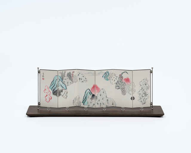 Color and ink on sixfold Chinese paper screen, with calligraphy on the back, customized ziricote base, 22 × 63 cm.