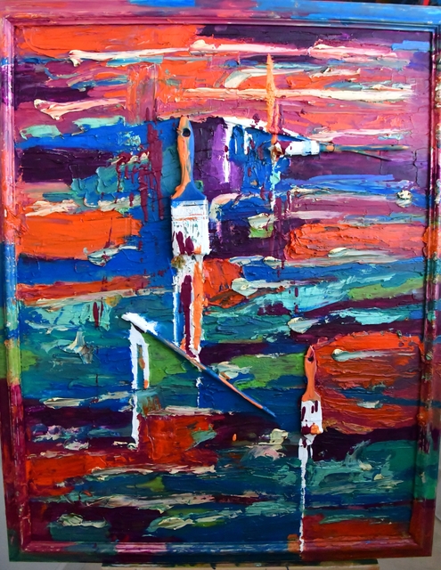 Oil on canvas with brushes, 90 × 70 × 2 cm.