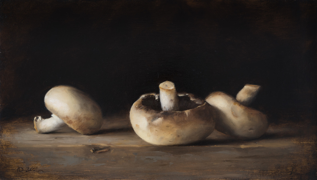 Still life image, 5 mushrooms on a tabletop: 2 large open mushrooms top left revealing the dark underside and stem, 2 more closed cap mushrooms to the right and centre and a small ...