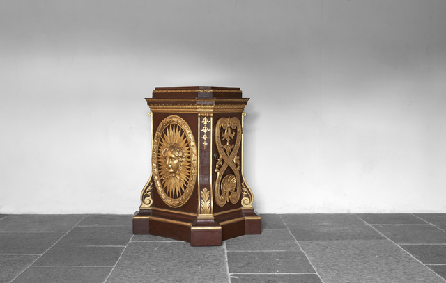 Title: George II, A George II painted and parcel gilt pedestal cupboard, the central panel having a bold Apollo mask on a sunburst. In the manner of William Kent. English (ca. 1735)