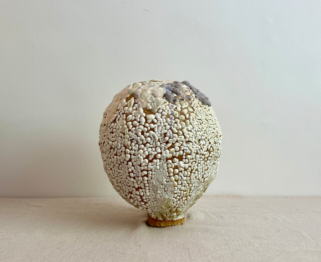 A vase with a wide mouth and tall broad shoulders that tapers at the bottom, above a slightly flared foot. The surface is covered with an organic design that resembled piled rows o...