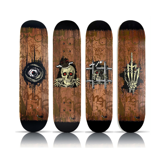 Screen print on (4x) 7-ply Canadian Maple hardwood skate decks.
