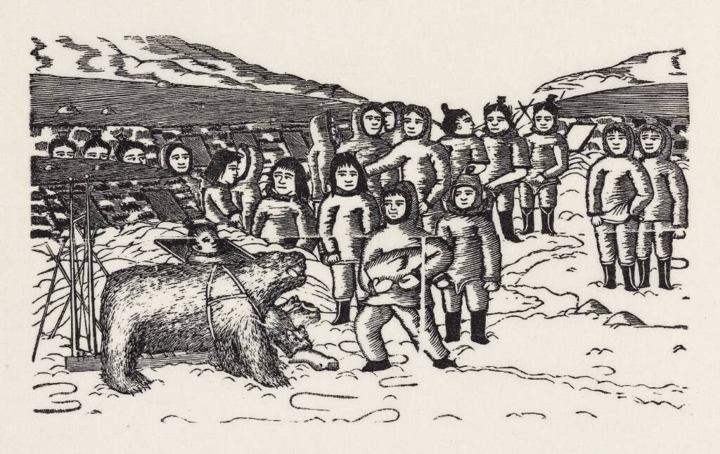 Title: Fortællingen om Ungilatake: Ungilatake fodrer isbjørnen og udyret, som han har fanget ene mand og bundet med remme