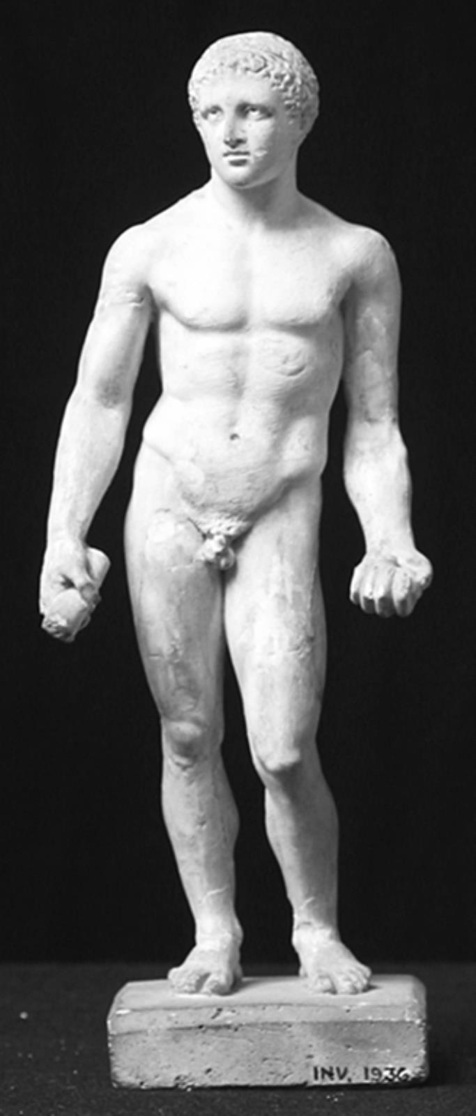 Title: Herakles, stående, i højre hånd rest af kølle, i venstre hånd restaureret hesperide-æble