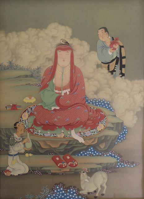 Nahan (Chinese, Luohan) Standing in a Landscape Viewing an Ink-Painted Scroll Depicting a Seated Bodhisattva While Assisted by an Elderly Male Attendant