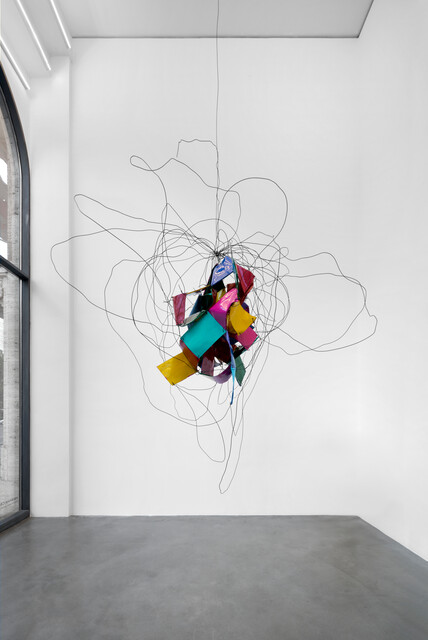 Acrylic on cardboard and paper, iron and copper, 265 × 200 × 240 cm.