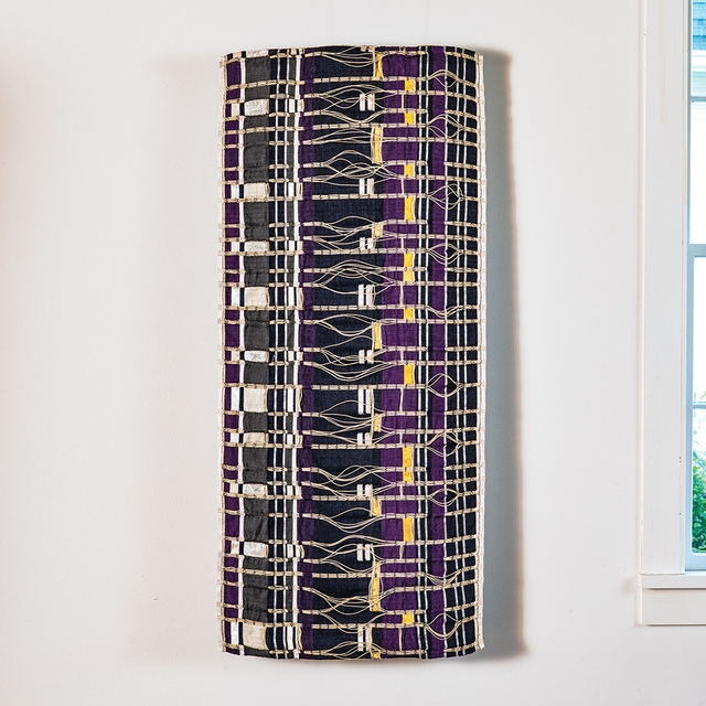 Metallic yarns and silver leaf, moriche palm fiber, silk, alpaca, 56 × 24 1/4 in.