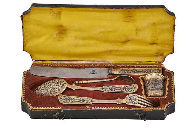 Title: Cased Russian Niello Silver Travel Place Setting (ca. 1840)