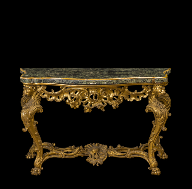 Title: Roman workshop, Console in carved, inlaid and gilded wood, top with curvy outline in greek Verde Antico marble edged with Giallo Antico marble (1770-1780)