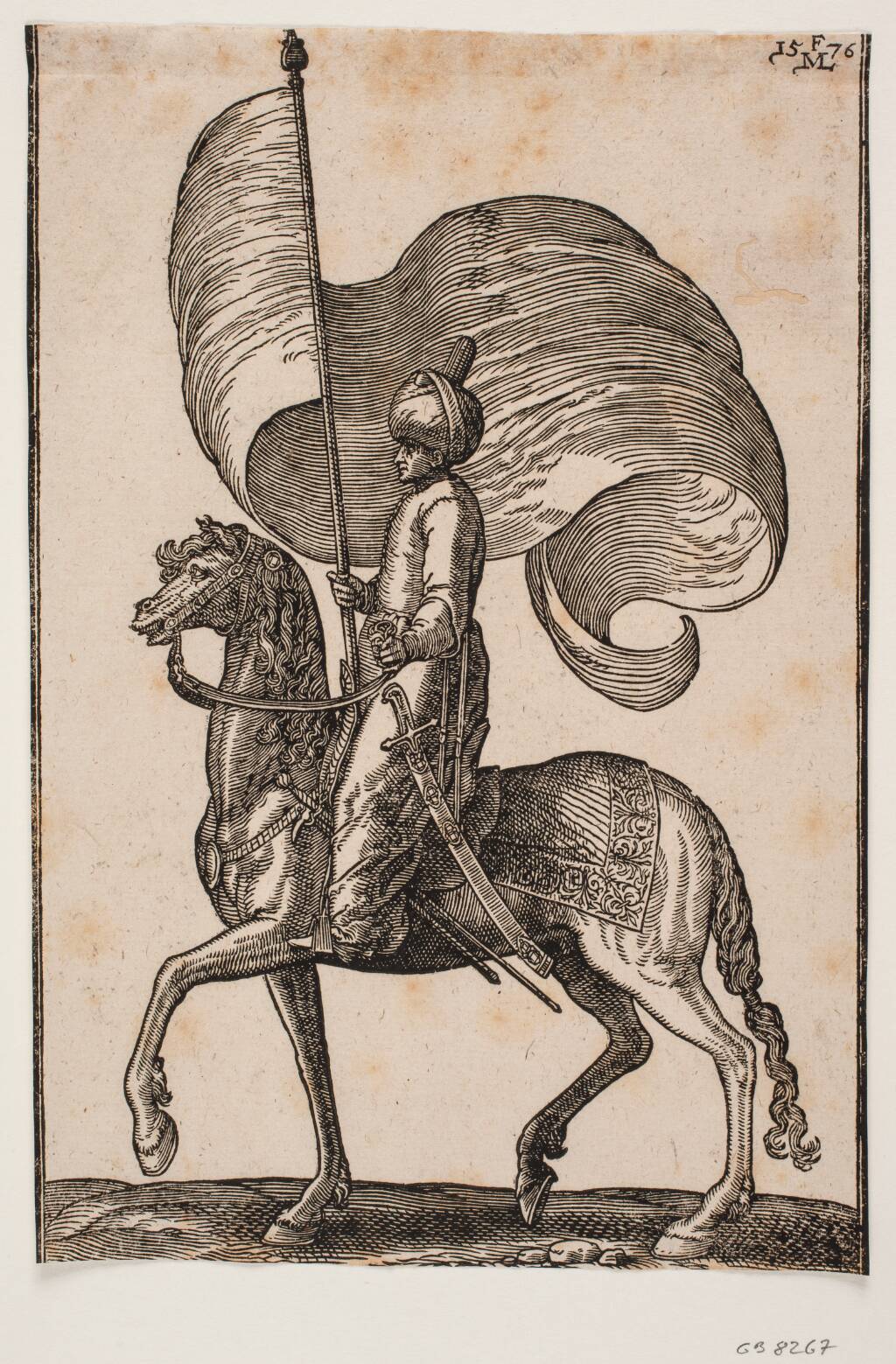 Bereden standartbærer, profil mod v.; standarten er 3-fliget og under den er ophængt en fjer; hans sværd anbragt mellem hans v. ben og hestens flanke