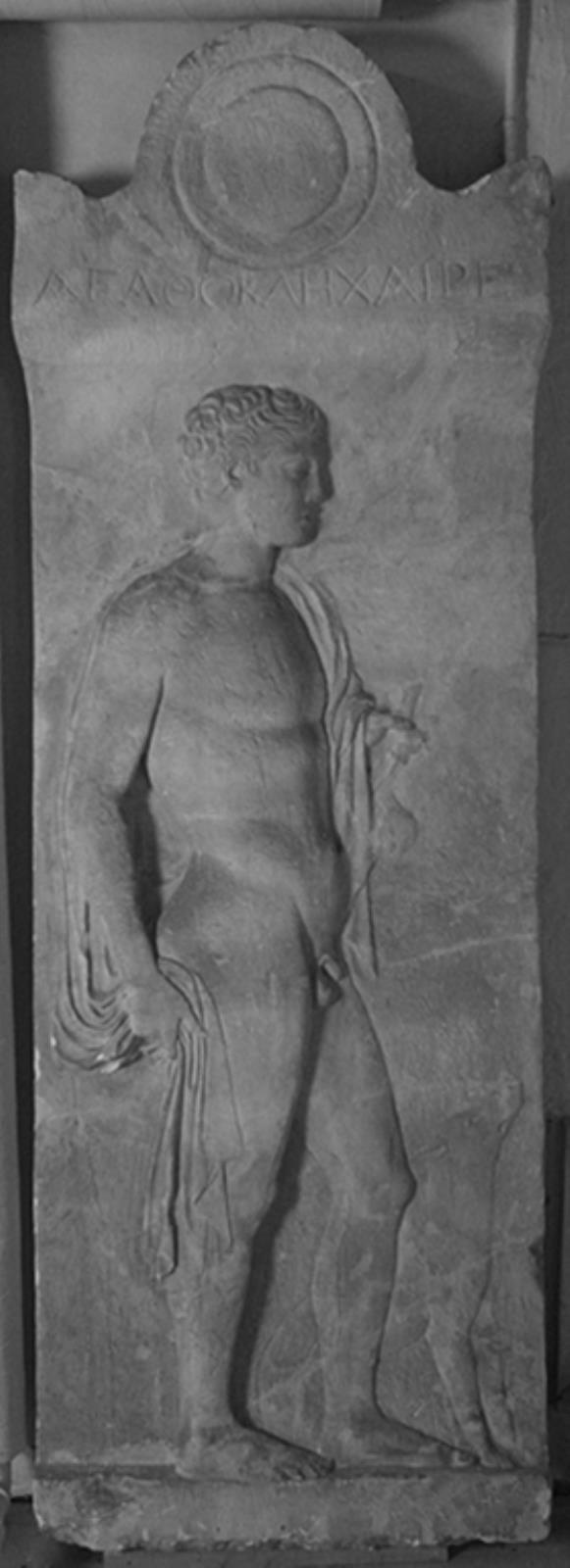 Gravrelief. Gravrelief for Agathokles. Stående ung mand mod h. med skrabejern og siddende hund