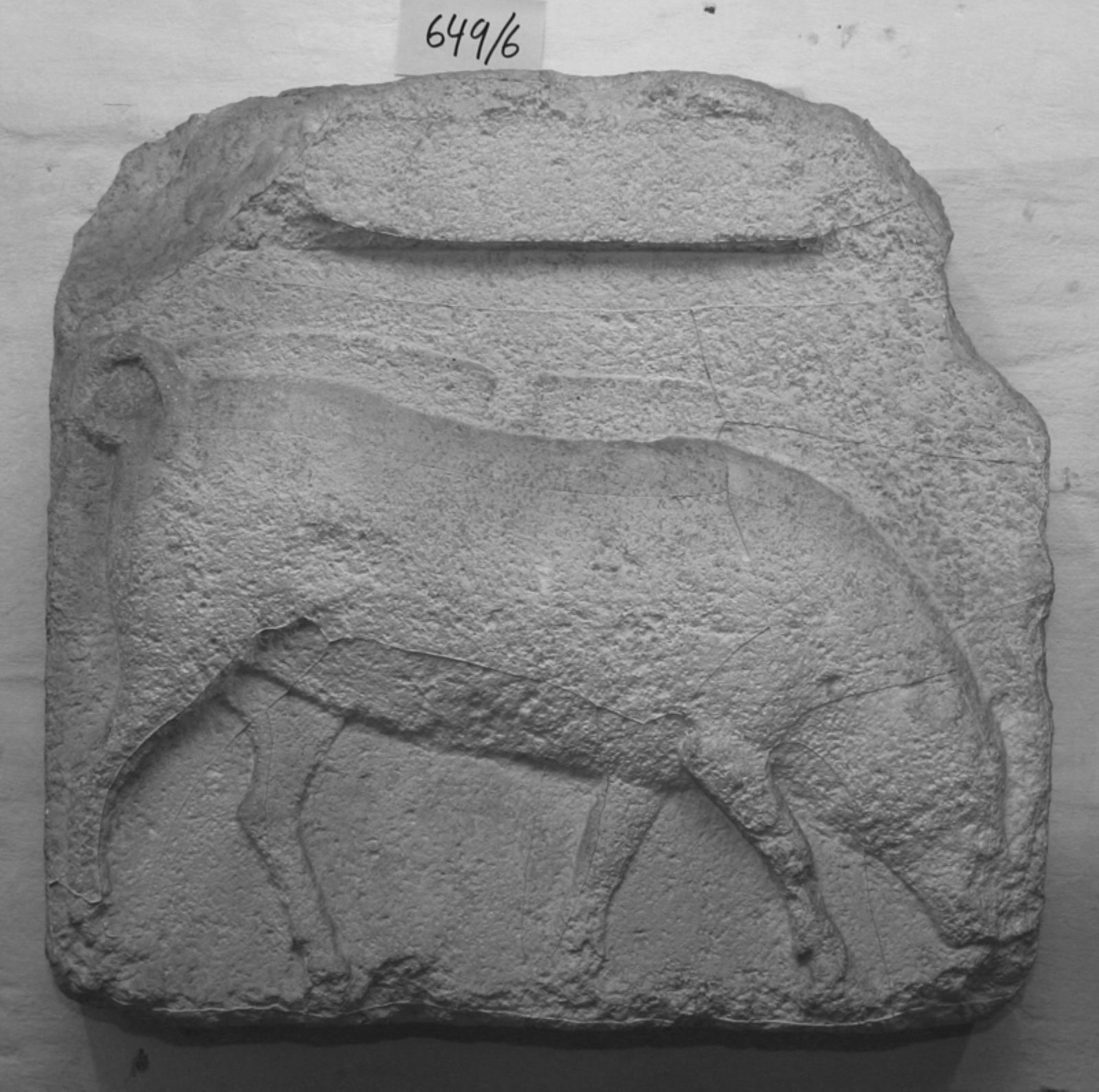 Gravrelief. Stående skægget mand mod højre med stav i venstre armhule og højre hånd rakt mod hund