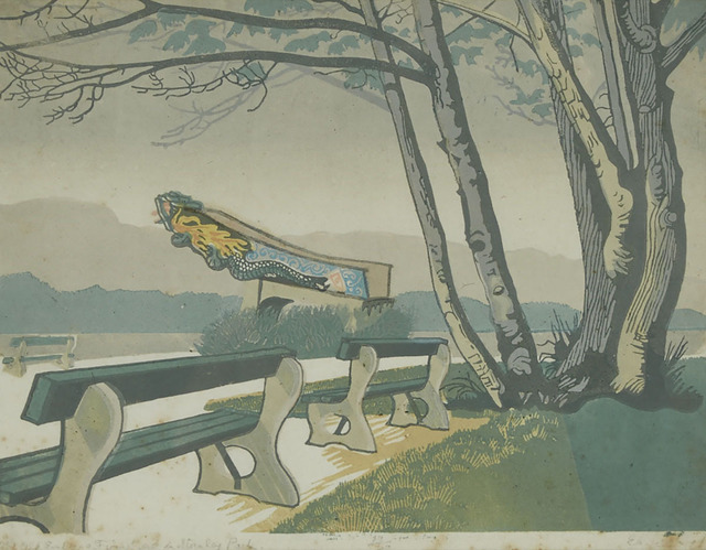 Colour linocut, 9 × 12 in.