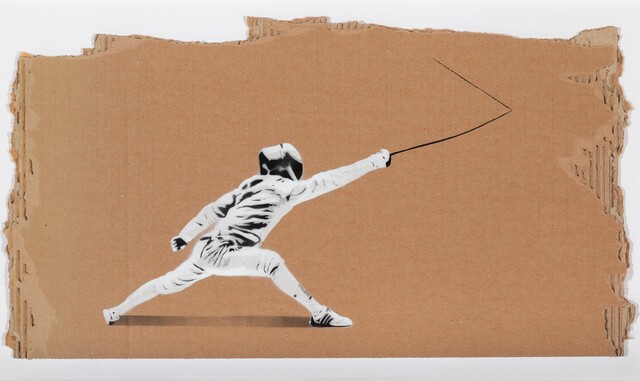 Spray paint and stencil on cardboard, 18 × 31 1/2 in...