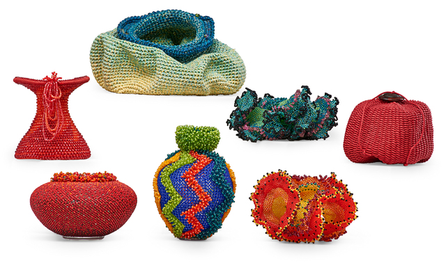 Title: David Chatt, Wendy Ellsworth, Barbara Jeanne Rice, Risa Benson, and Nancy Moore Bess, Two vessels by David Chatt, two Seaforms by Wendy Ellsworth, one vessel by Barbara Jeanne Rice, one woven vessel by Risa Benson, and another woven vessel by Nancy Moore
