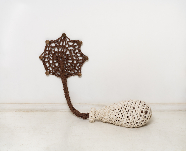 Cotton voile crochet, expanded clay and wooden knobs, 73 × 95 × 46 cm.