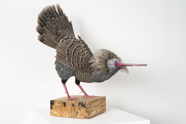 Pheasant peacock feathers, African Gray parrot feathers, rooster feathers, guinea fowl feathers, resin spoon bill, resin, 21 × 10 × 21 in.