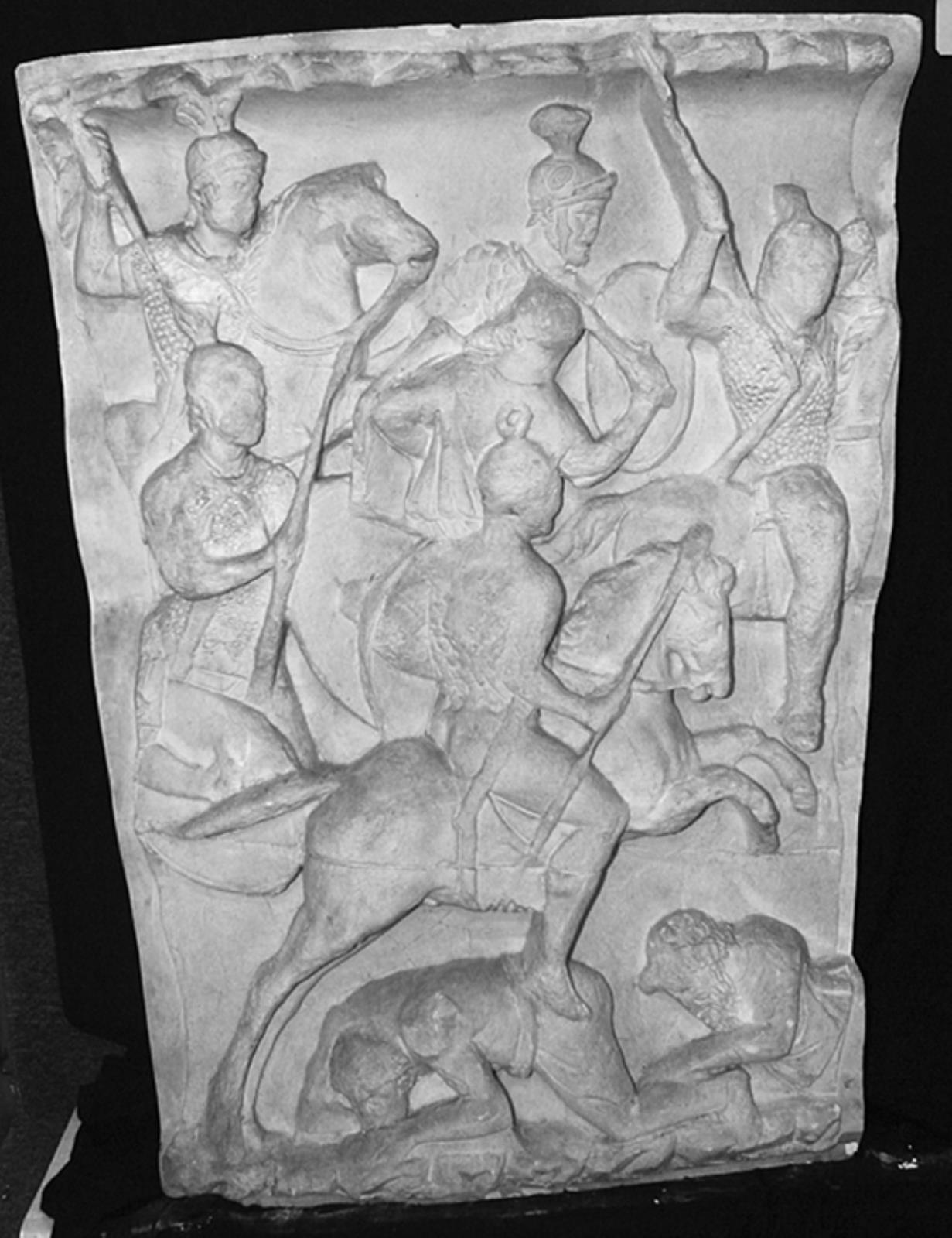Romerske soldater stikker fjenden ned. Forrest kæmper en af barbarerne stadig oprejst
