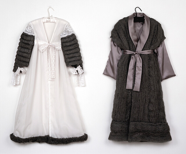 Steel wool, nylon, lace and satin hangers, 56 × 72 × 7 in.