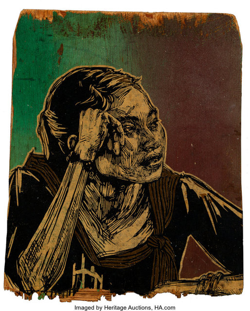 Woodcut print and acrylic on found wood, 15 1/2 × 12 1/2 in.