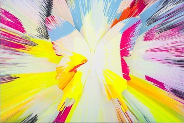 Acrylic and diamond dust on stretched canvas with aluminum butterfly, 36 × 36 in...