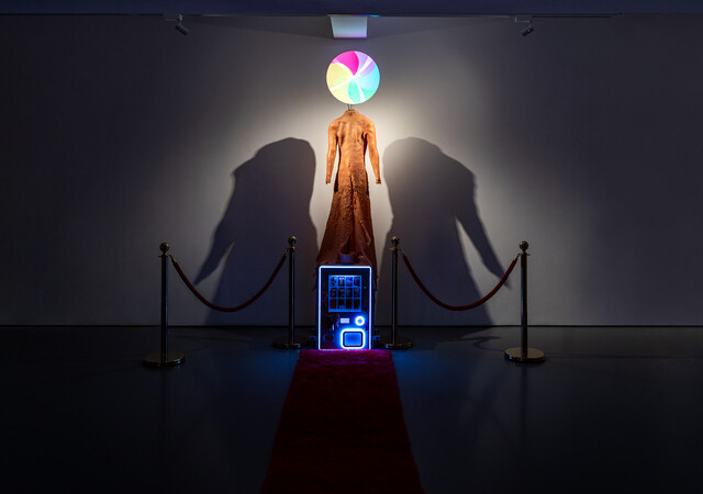 3D hologram projector fan, custom-made trading cards, card vending machine, aluminum alloy, stainless steel, silicone, glass, carpet, stanchions, 270 × 320 × 490 in.