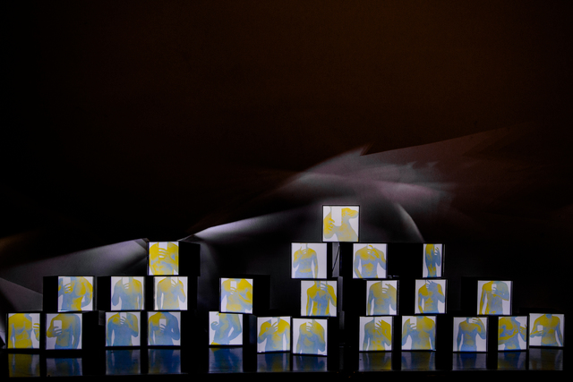 3D hologram projector fans, multi-channel soundtracks, speakers, aluminum scaffolds, wires, acrylic tubes, 250 × 450 × 407 cm...