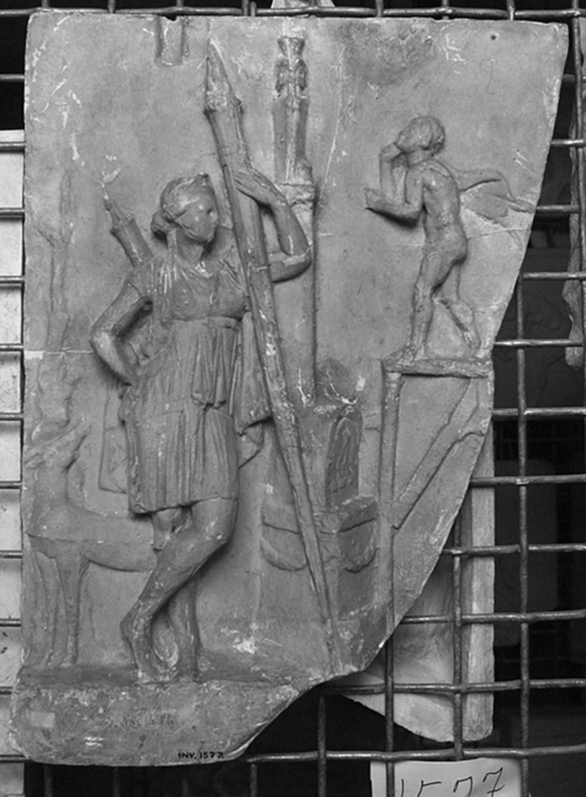 Title: Stående Artemis med fakkel ved alter, til højre ung mand oppe på bord vendt mod et hekateion
