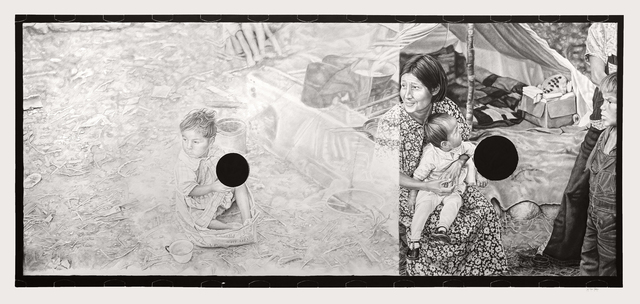 Charcoal, graphite and ink on paper [Archive Text: “Untitled photo, possibly related to: Indian family, blueberry pickers, near Little Fork, Minnesota.” Original 35mm nitrate negative by Russell Lee dated August, 1937. Courtesy of the Library of Congress.] This drawing was created in collaboration with U.S. Poet Laureate Joy Harjo. Her poem in response to this work can be found at the beginning of the collectors preview, and this collaboration will be published with many others in a forthcoming book from Left Field Press., 42 × 86 in