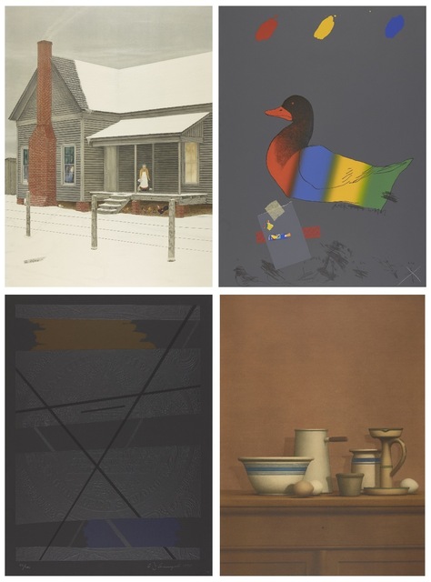 Allan D'Arcangelo, William Bailey, Raymond Saunders, and Velox Ward, Four works from America: The Third Century Portfolio, 1975: Beginning; Still Life with Eggs, Candlestick and Bowl; Duck Out of Water; The Home My Daddy Built; Concord
