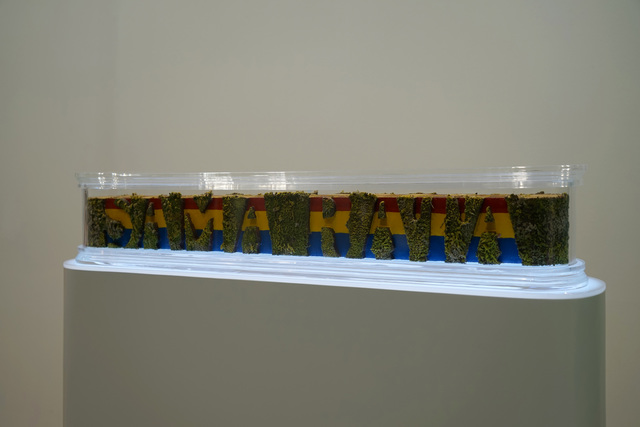 Wood, acrylic sheet, resin, puff ink, colored pigment, 17 × 105 × 18 cm.
