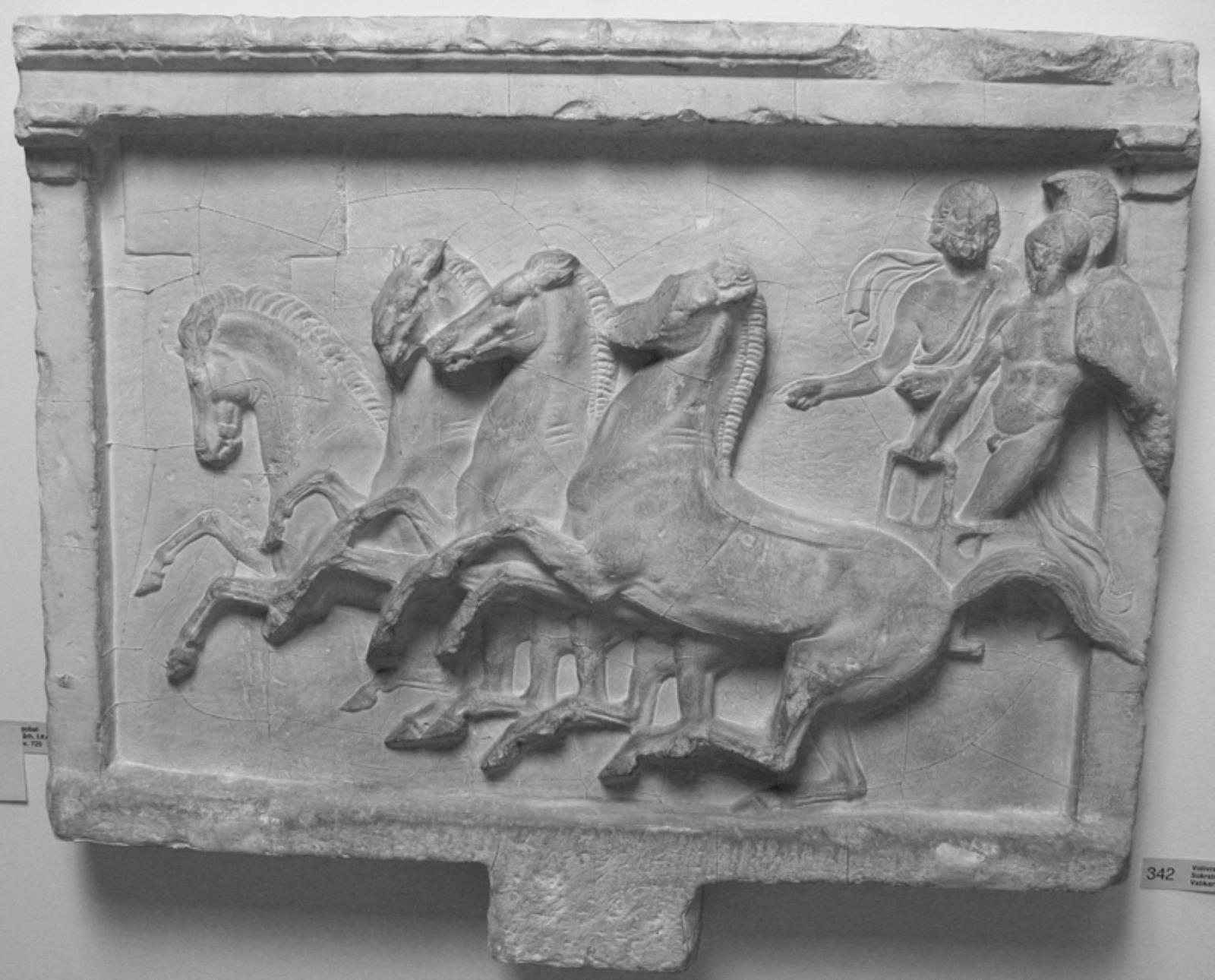 Title: Votivrelief. Firspand med vognstyrer og apobat mod v.