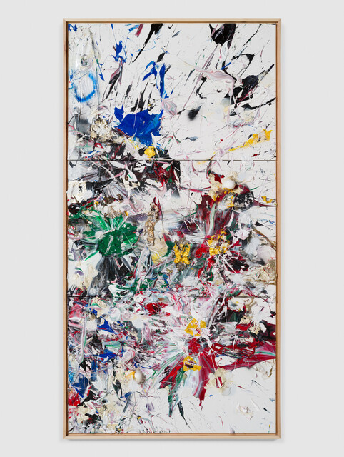 Acrylic paint, spray paint, household paint sheets, handmade sterling silver, egg and carpet wrap plastics on canvas, 244 × 183 × 15 cm...