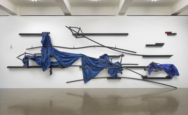 Metal rails, anodized pipes, painted pipes, plastic pipes, tarp, bike frames, motorcycle frame, mylar foil, 390 × 1260 × 35 cm.